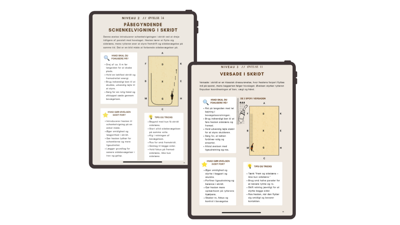 Her får underviseren både illustrationer og beskrivelser af hver enkelt øvelse samt en klar og overskuelig visuel udviklingsplan gennem hele dressurens rejse, som de kan dele med deres elever.