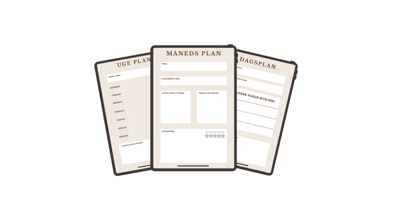 Du får planlægningsark, der hjælper dig med at strukturere og følge din og din hests udvikling over tid – helt konkret og overskueligt.