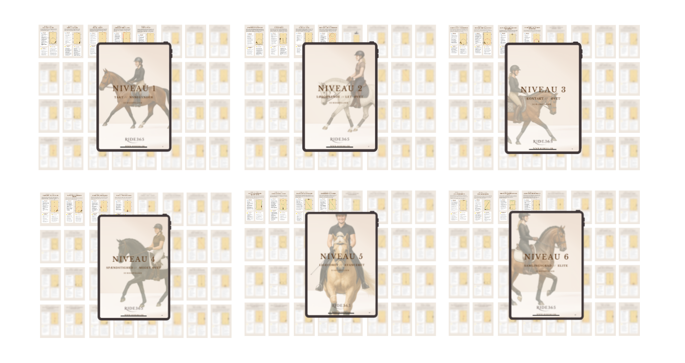 Ride365 er bygget op omkring 6 klare træningsniveauer, inspireret af dressurens træningsskala. Hvert niveau har sit eget fokus og leder dig systematisk videre til næste trin i din og hestens udvikling.